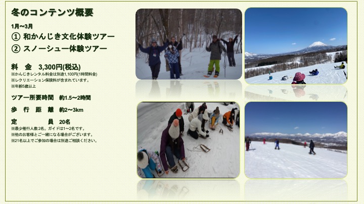 その他:雪が靴に入らないよう、長靴・スパッツの他、ニット帽、手袋をご用意ください。※ない場合はこちらで貸し出ししております。