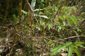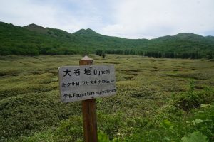 コースの出発点「大谷地」何もない原っぱに見えますが、これも湿原で、北海道の一部のみでしか見られないフサスギナの群生地となっています。北海道ではいたるところで「谷地」と名がついた地名や植物を耳にします。「谷地」はアイヌ語由来の言葉で「湿地・泥地」を意味します。ヤチダモやヤチハンノキ、道東の寒い地域で見られる「ヤチボウズ」、札幌市営地下鉄の駅にも大谷地駅という駅名が存在し馴染みのある名前です。