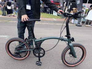 BROMPTON G-LINEと呼ばれるオフロードモデル。16→20インチへ大径化?タイヤは「SCHWALBE G-ONE ALLROUND」。20×2.10?サイズかなり太めのタイヤを装着したものが試乗車として展示されており、実際に試乗させてもらいました!大径化による安定感。走り出しも大変スマートで変速はInter-8と呼ばれる内装「Shimano Alfine8speed」まさにノーストレス!極上の乗り心地です。